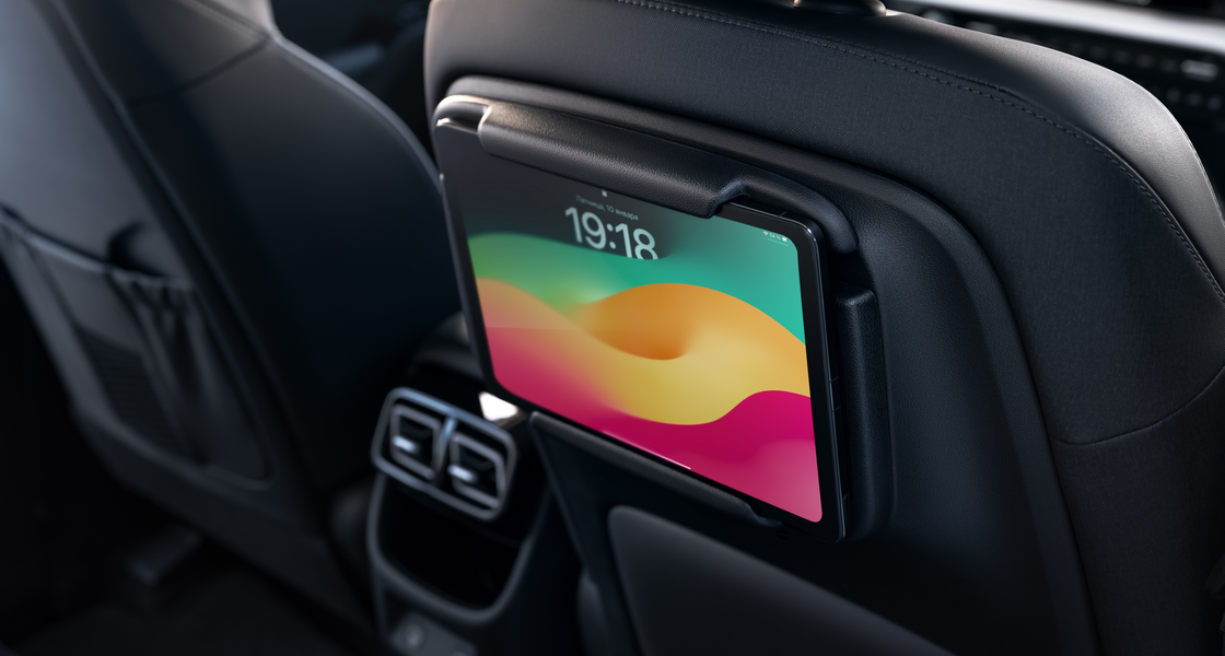 Крепление для планшета на спинке переднего пассажира обеспечивает комфортное использование гаджетов во время поездки